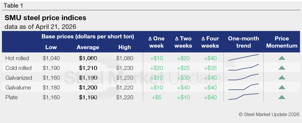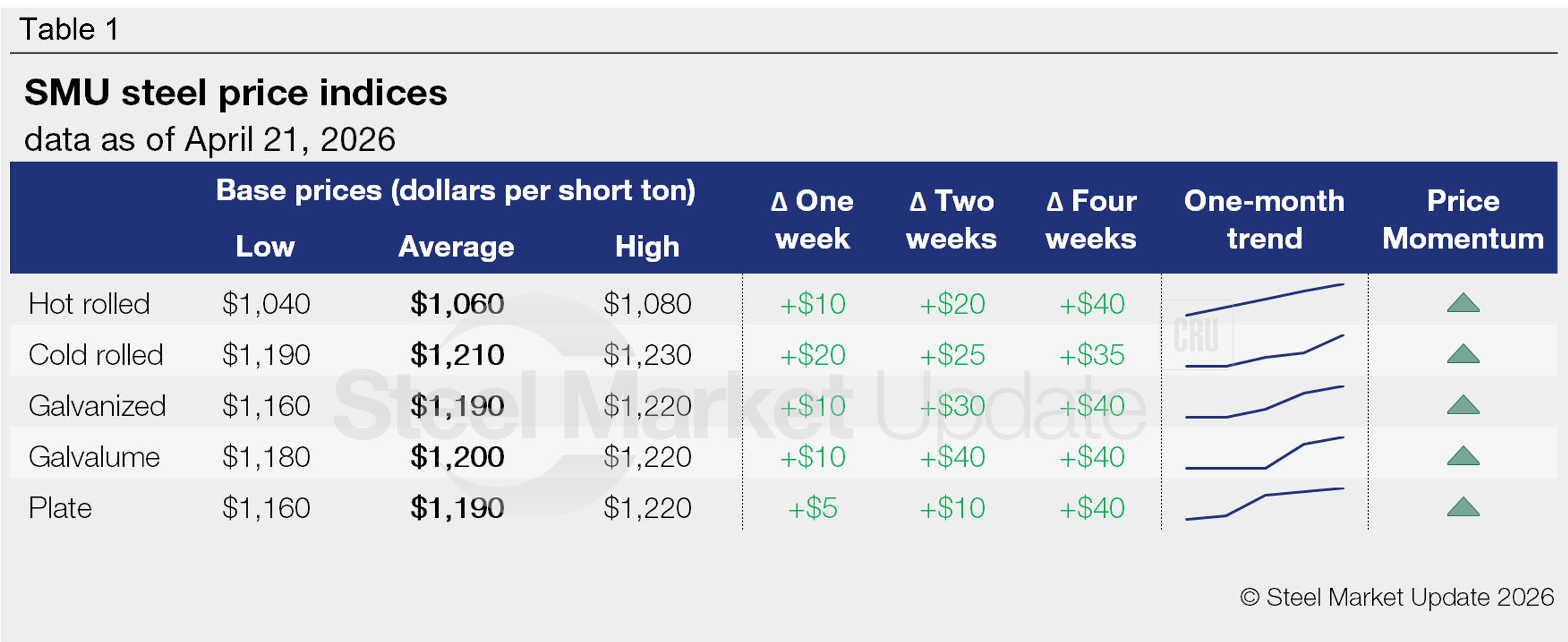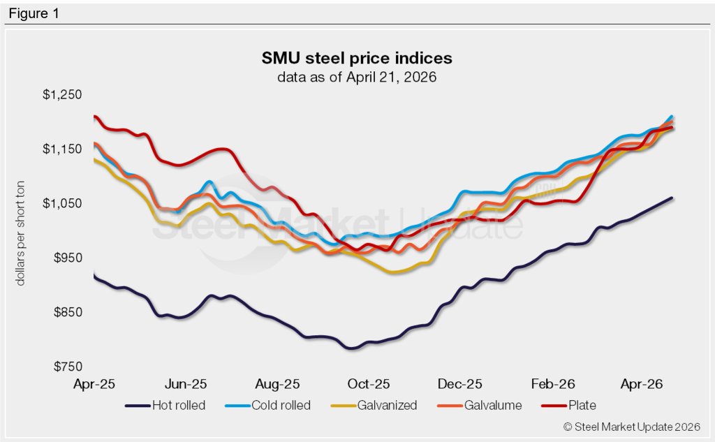 Hot-rolled lead times range from 4–10 weeks, averaging 6.6 weeks as of our April 16 market survey.