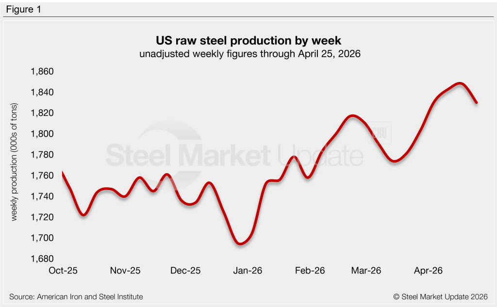 Domestic raw steel production was estimated at 1,830,000 short tons (st) in the week ending April 25, down 18,000 st or 1.0% from the prior week (Figure 1). This decline comes just one week after output climbed to 1,848,000 st, the highest weekly rate recorded since November 2021.
