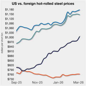 The price gap between US hot-rolled coil and landed offshore product inched higher, even as prices stateside and abroad mostly moved in tandem vs. last week.