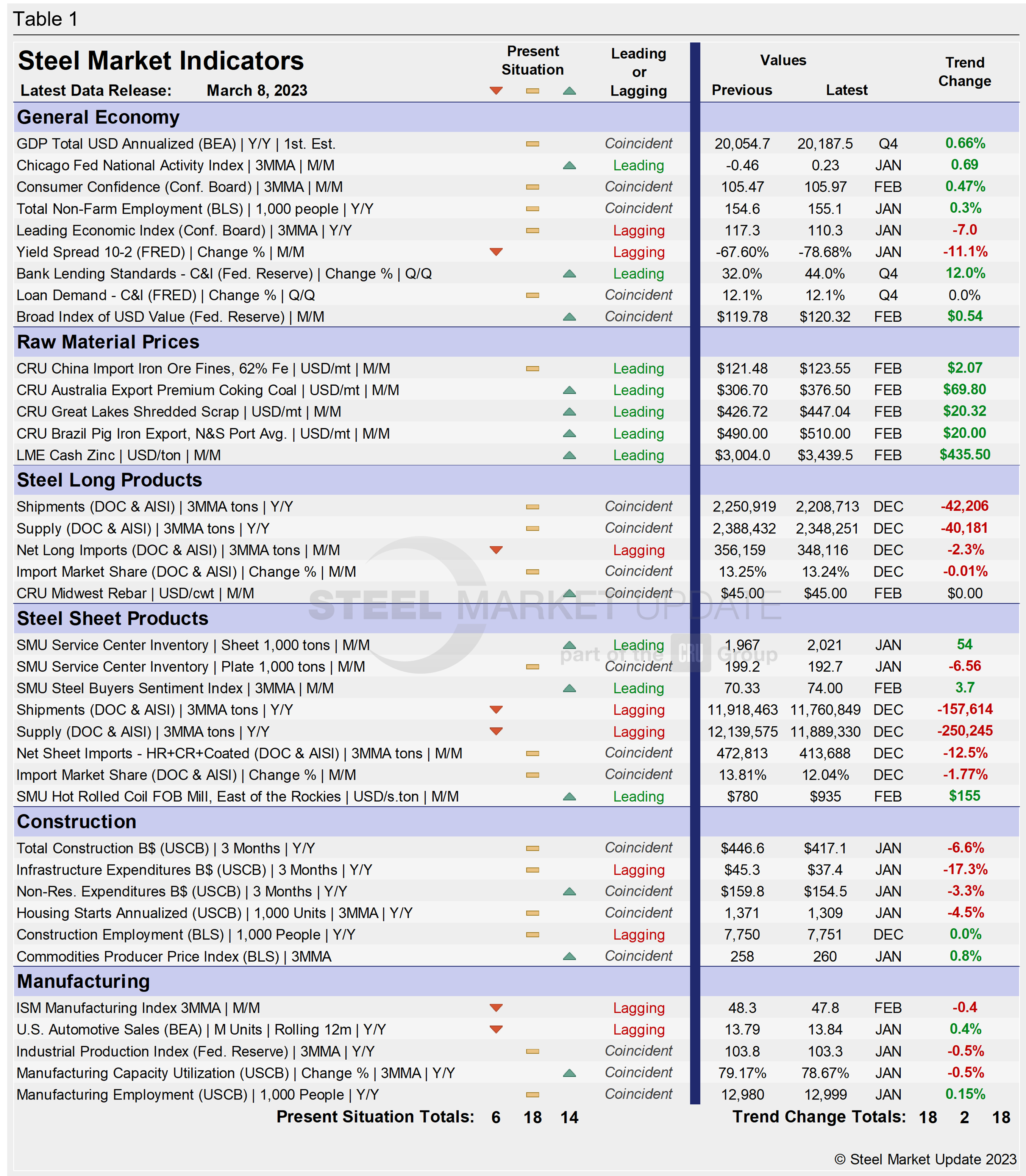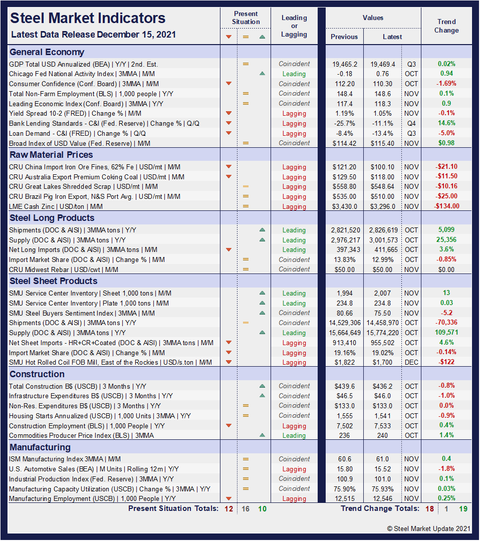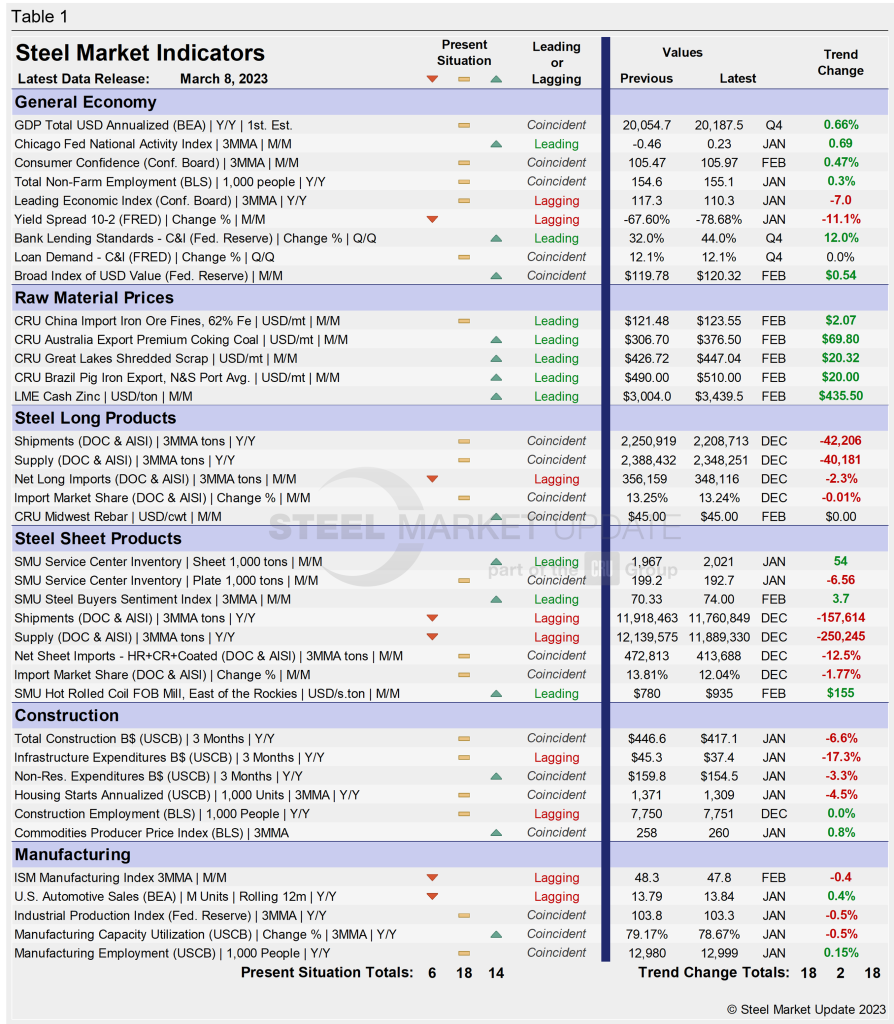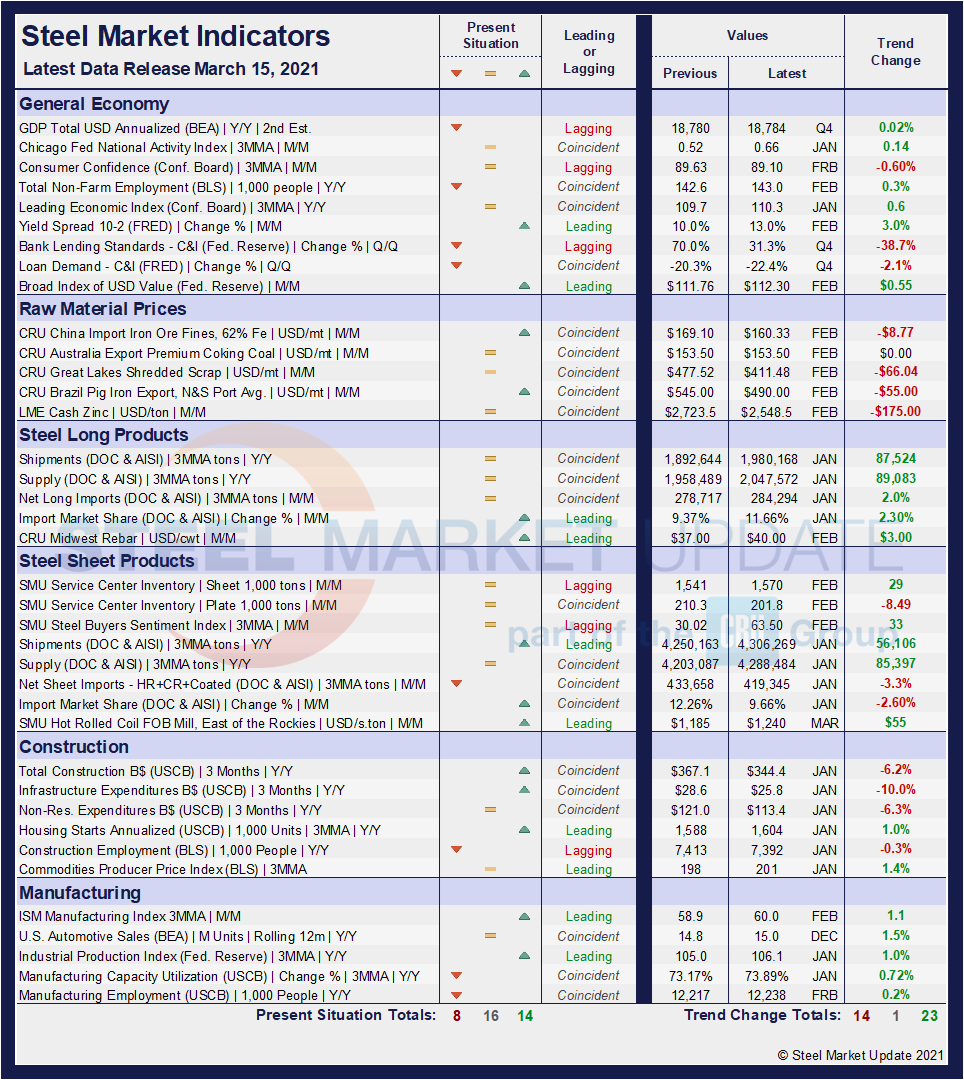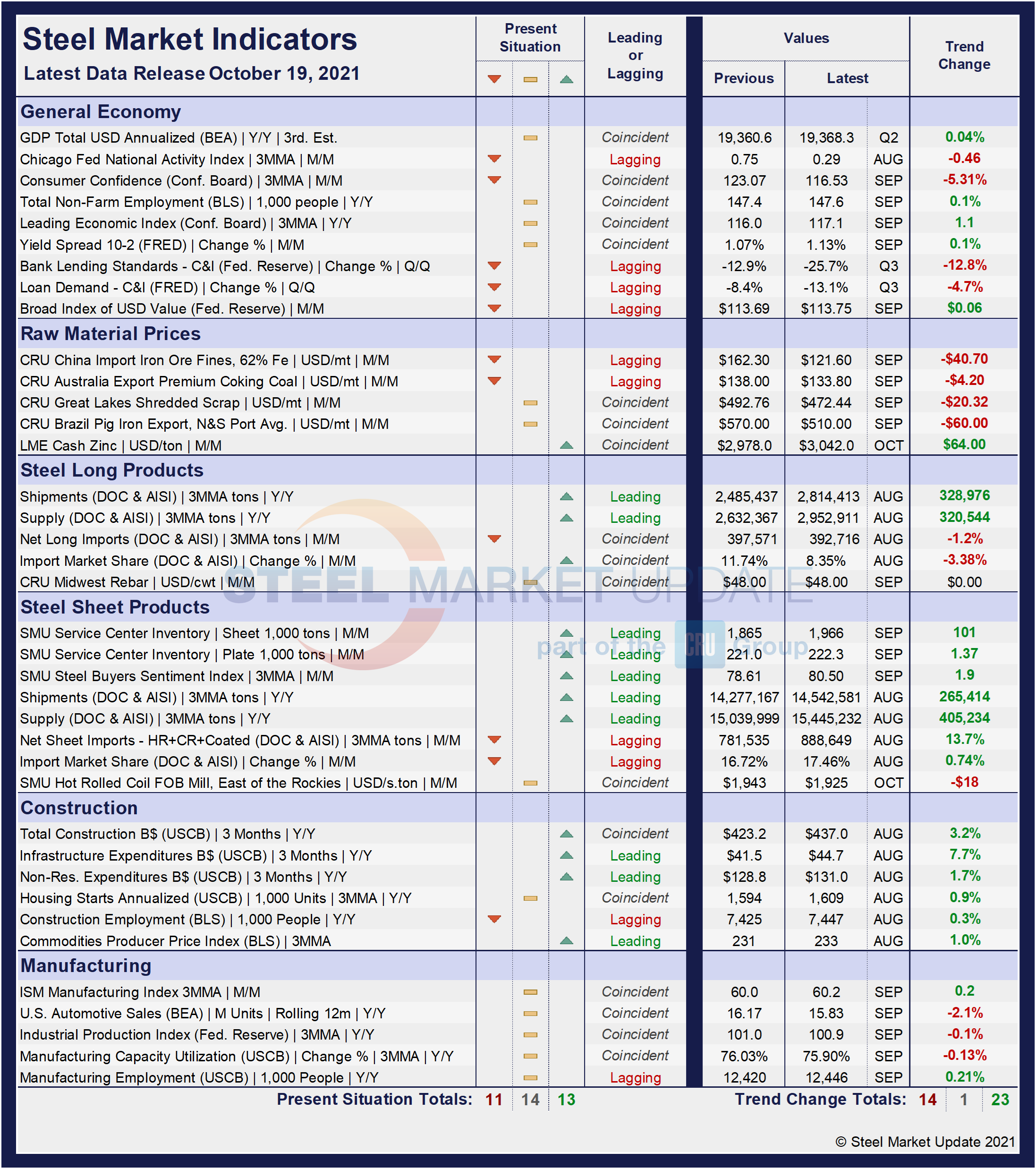 Steel Market Update’s Key Market Indicators are composed of economic and steel industry factors that are compiled and analyzed by SMU market analysts. They are broken into the following categories: General Economy, SMU Indices, Long Product Steel, Flat Rolled Steel, Construction, and Manufacturing. The table below represents the current meta-analysis of all of our Key Steel Market Indicators. For more information about each data set please click on the links in the ‘Indicators’ box to the right. An explanation of the Key Market Indicators is provided beath the table.