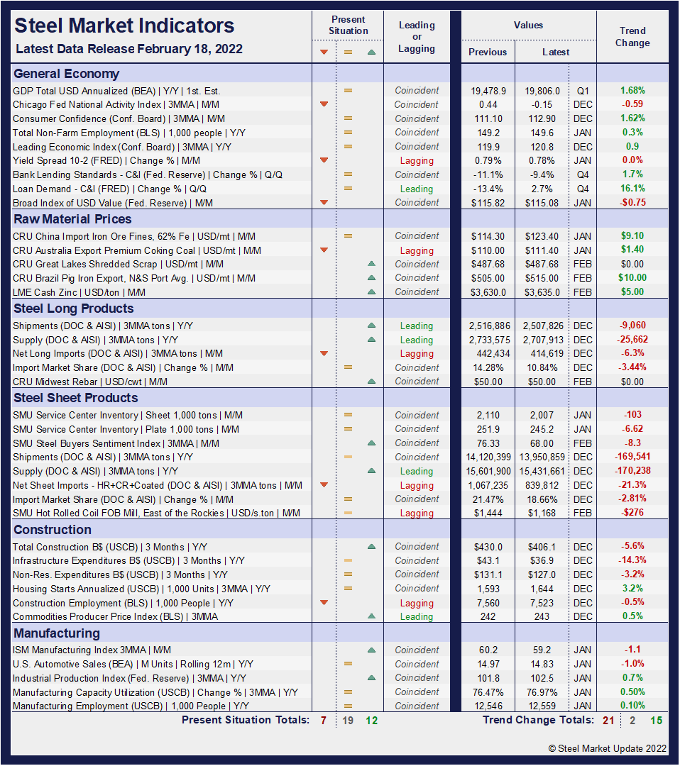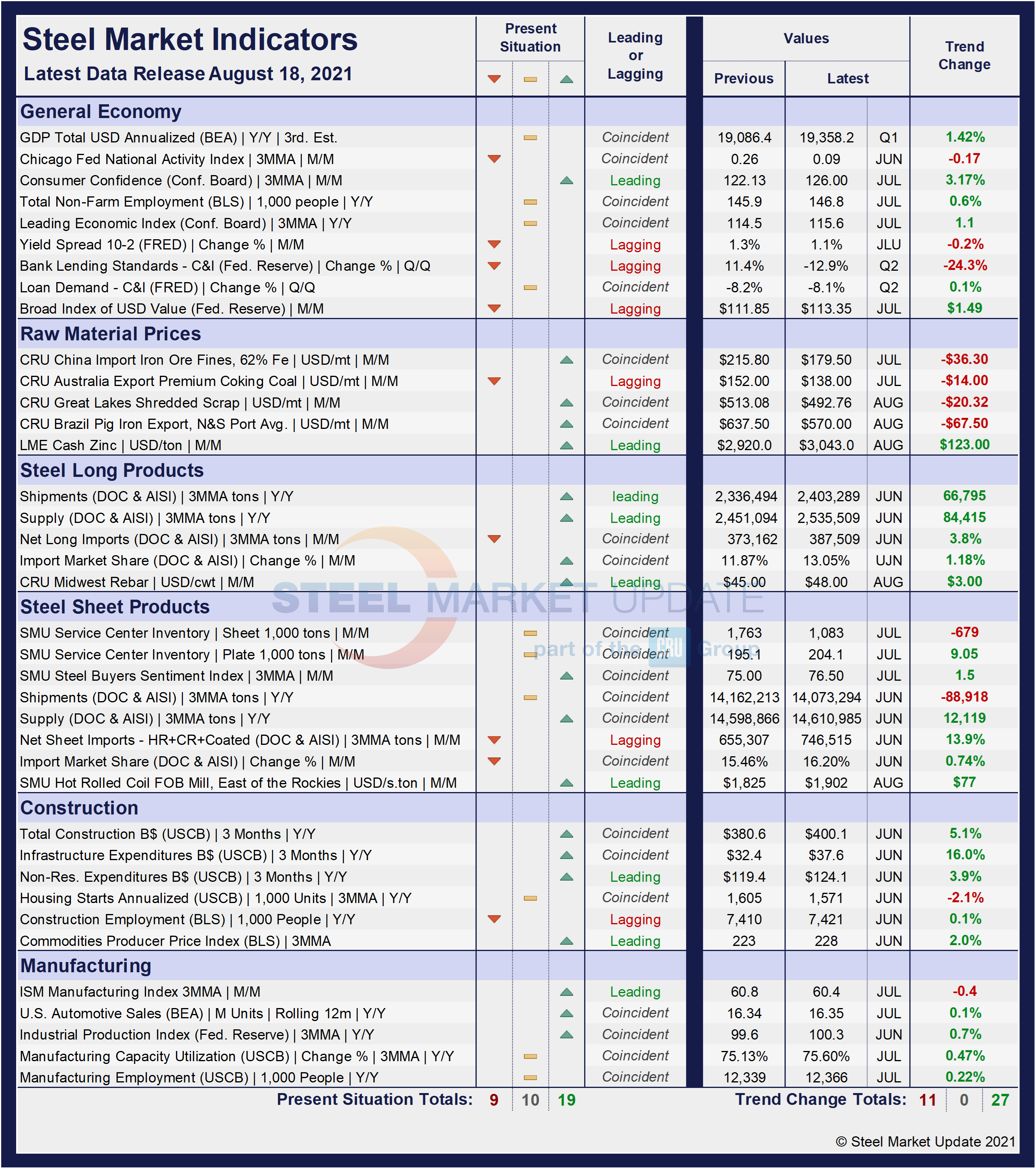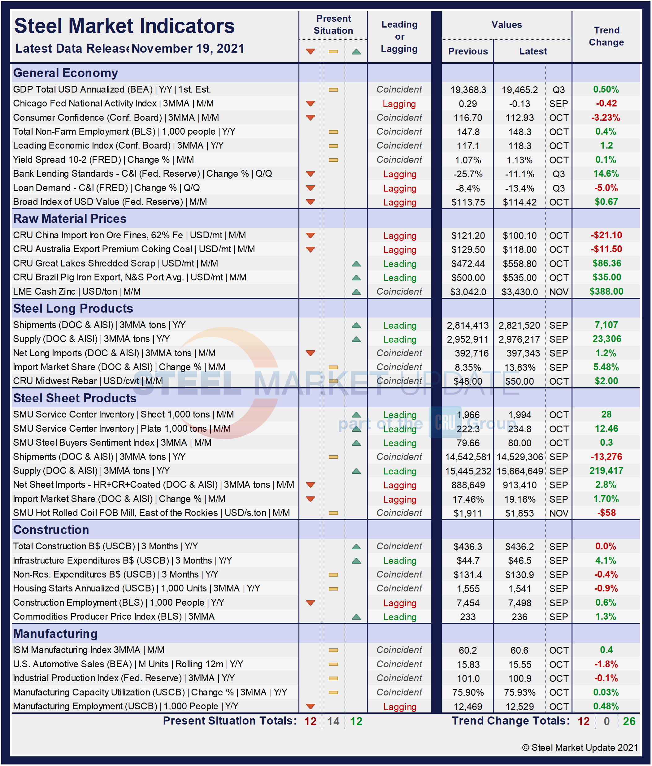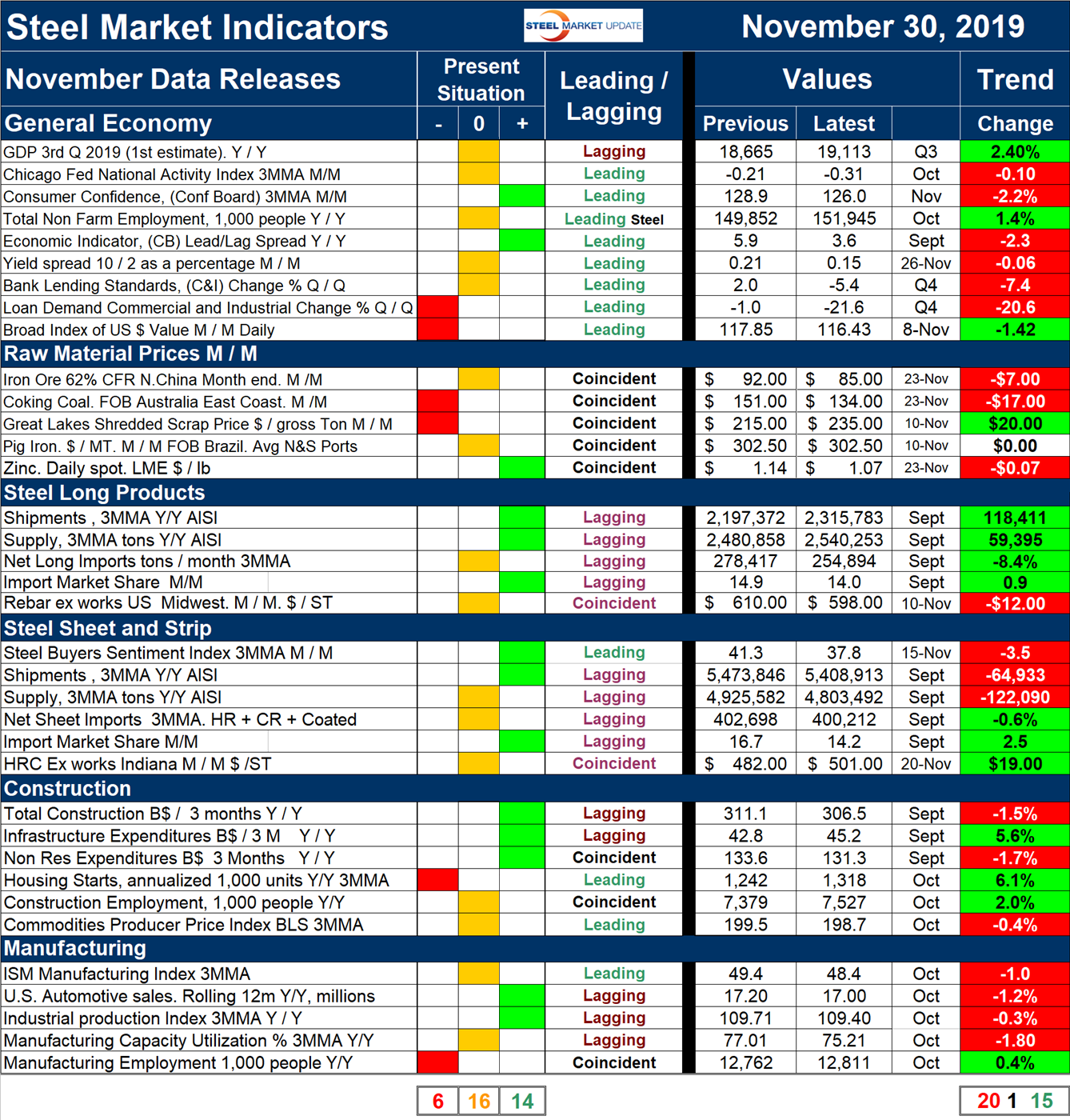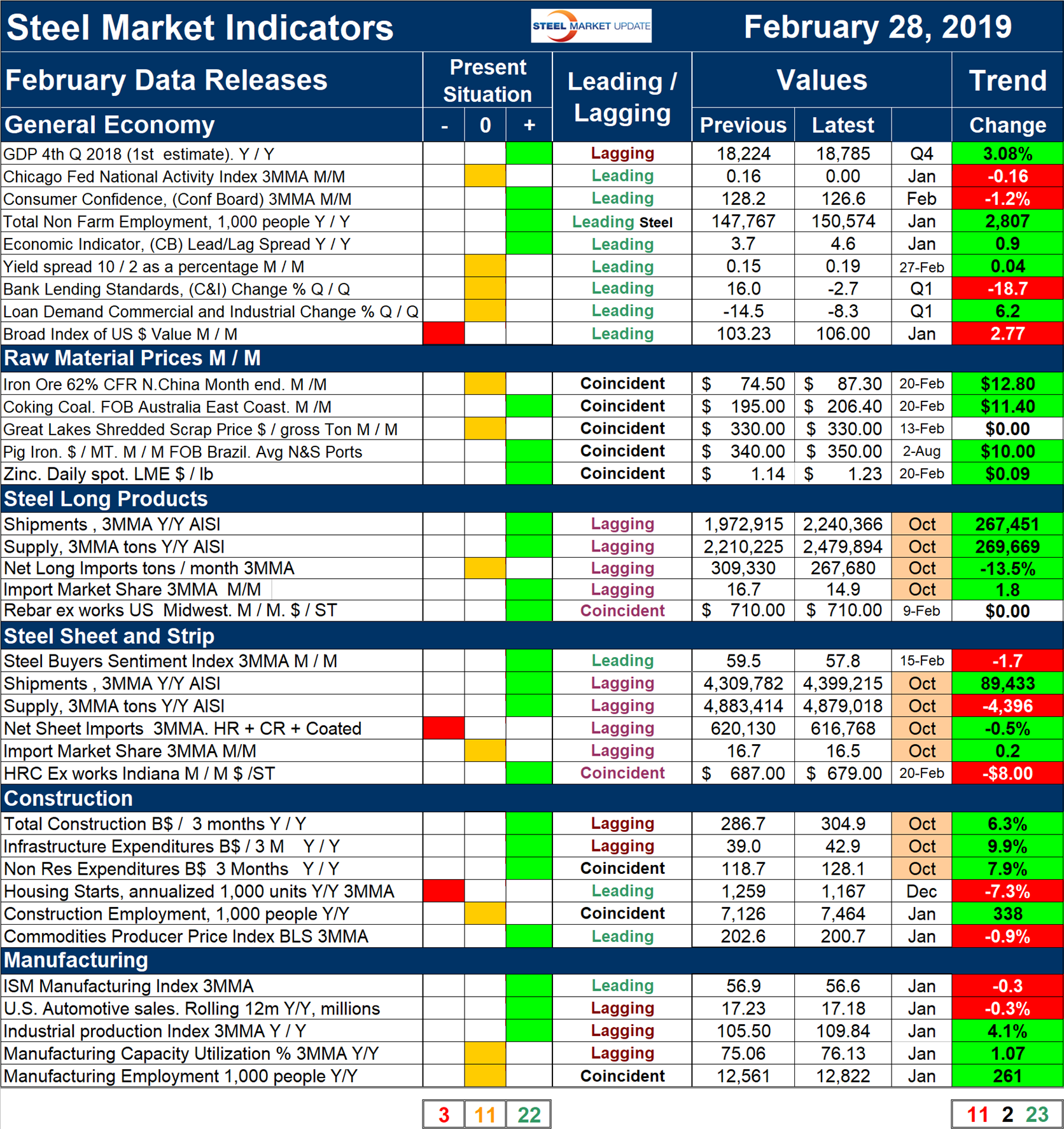 Steel Market Update’s Key Market Indicators are composed of economic and steel industry factors that are compiled and analyzed by SMU market analysts. They are broken into the following categories: General Economy, SMU Indices, Long Product Steel, Flat Rolled Steel, Construction, and Manufacturing. The table below represents the current meta-analysis of all of our Key Steel Market Indicators. For more information about each data set please click on the links in the ‘Indicators’ box to the right. An explanation of the Key Market Indicators is provided beath the table.