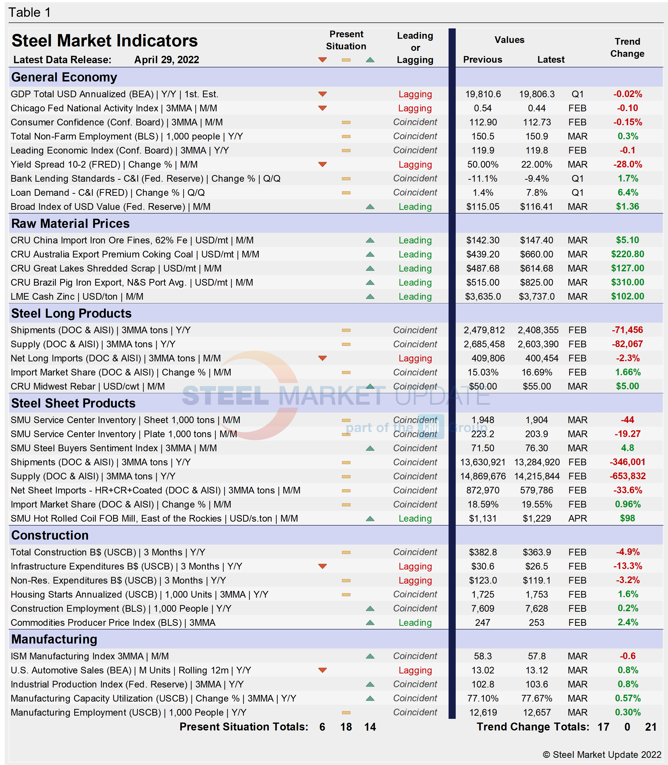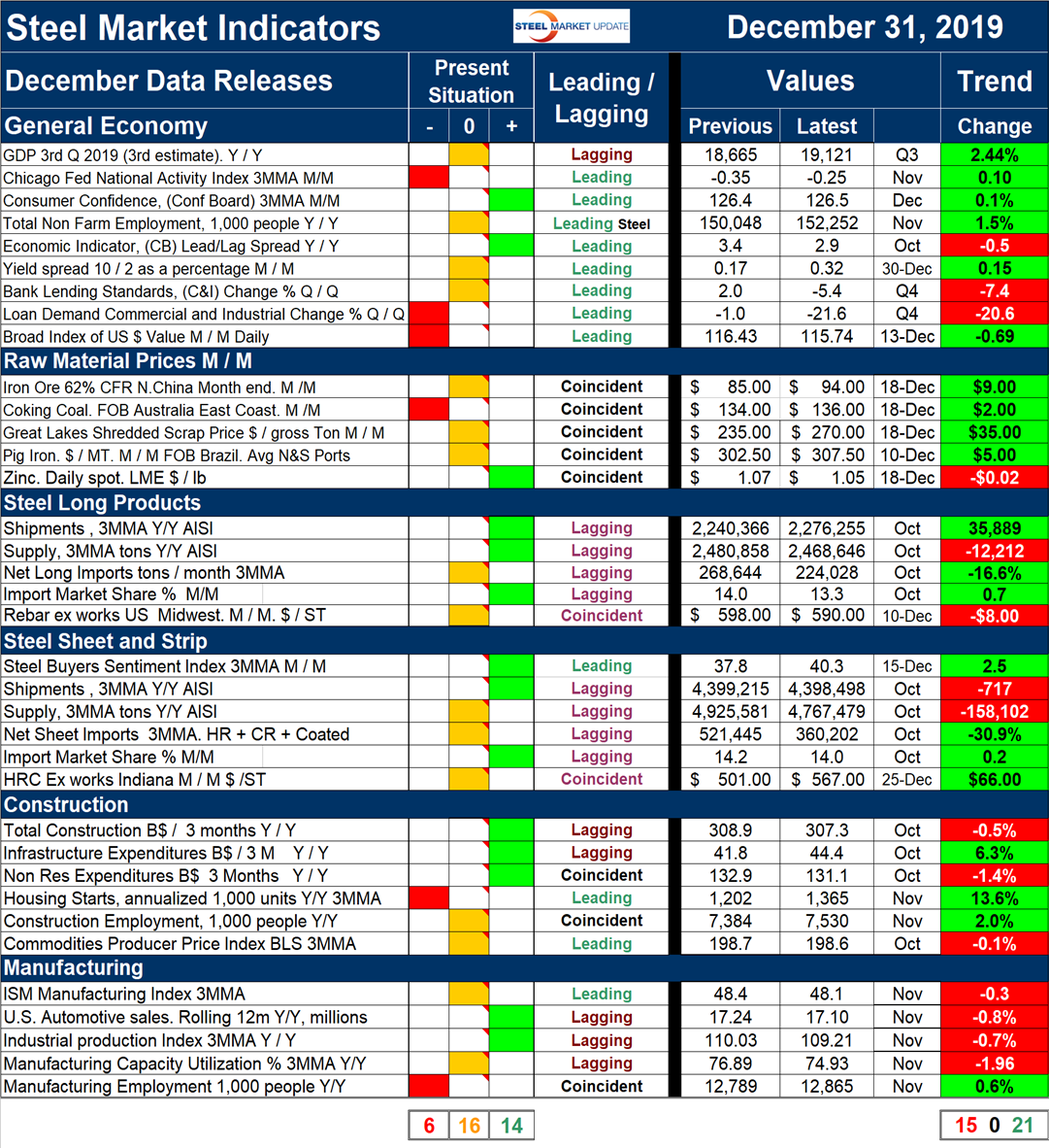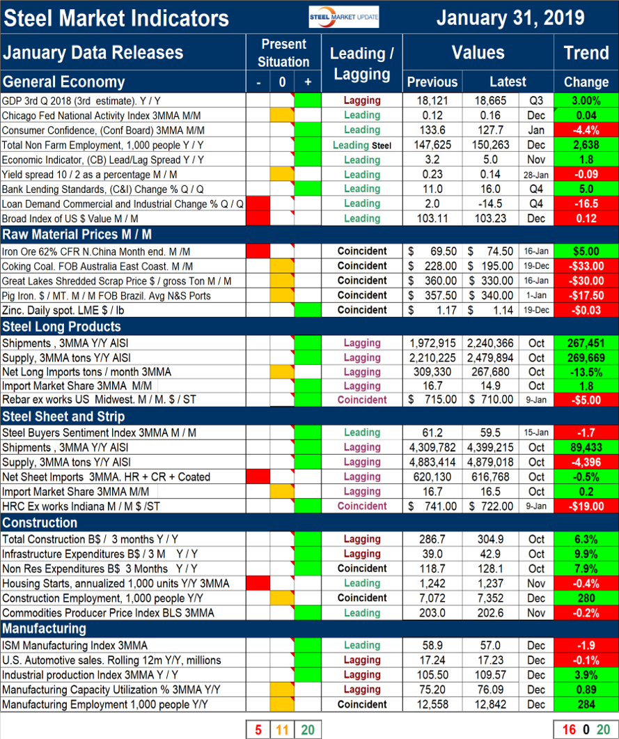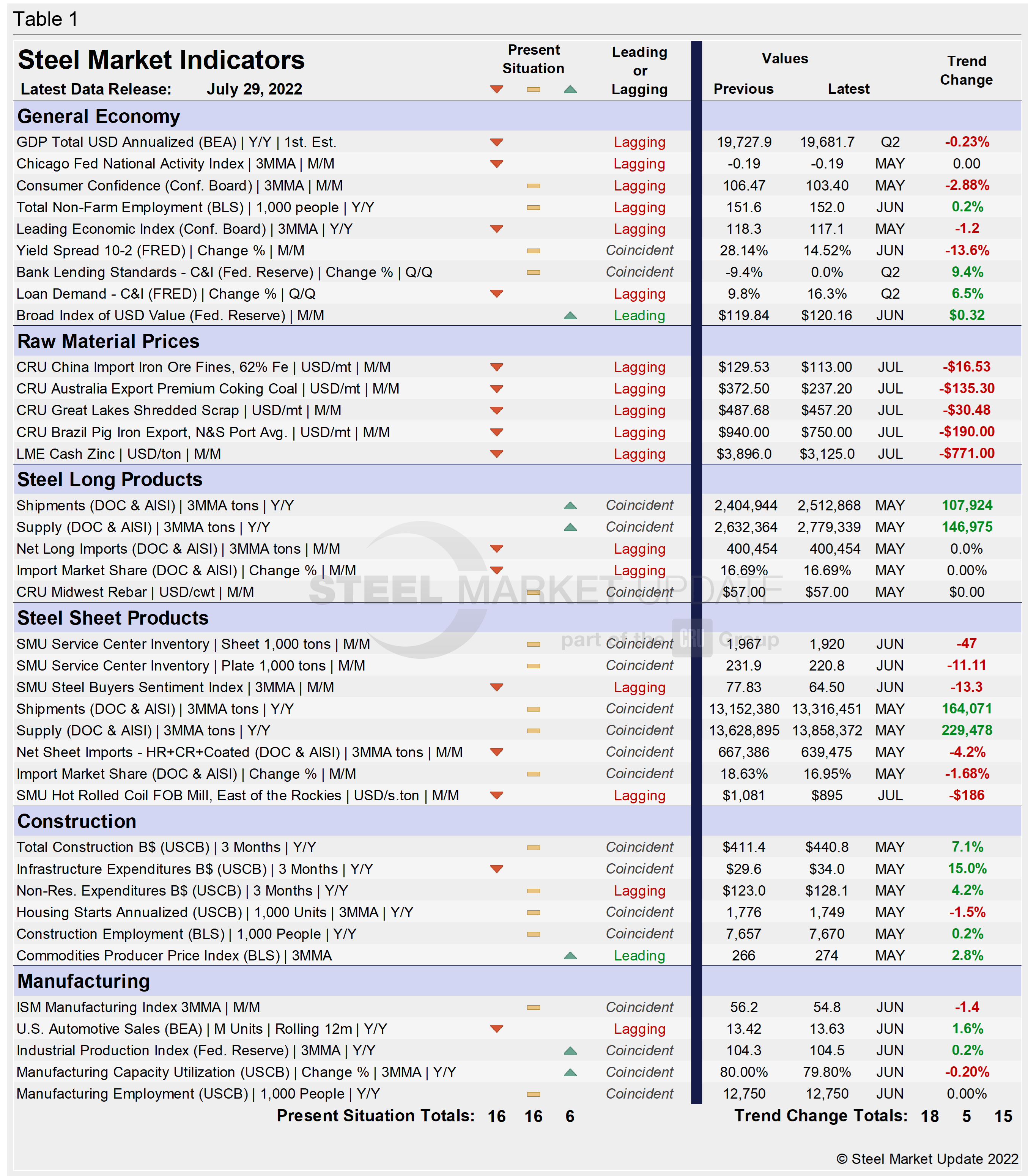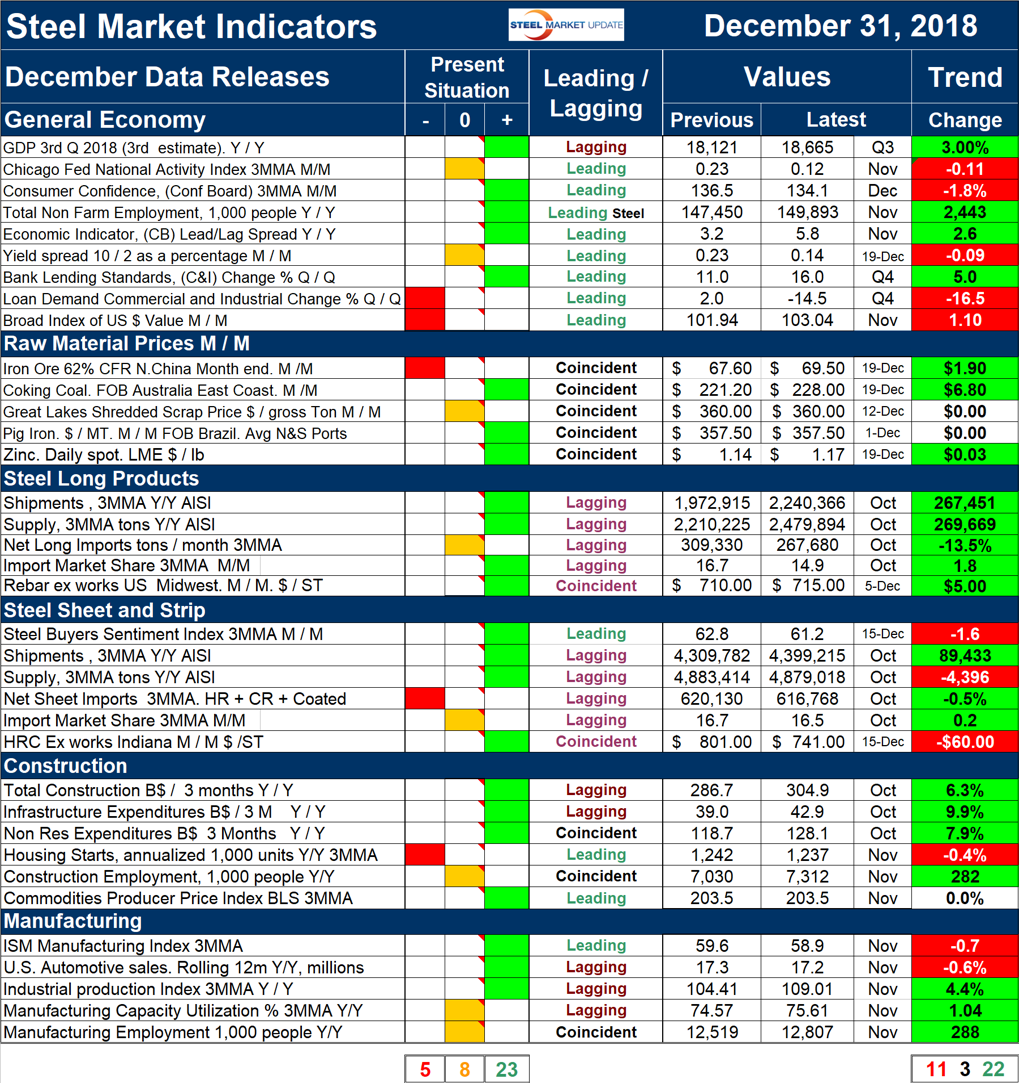 Steel Market Update’s Key Market Indicators are composed of economic and steel industry factors that are compiled and analyzed by SMU market analysts. They are broken into the following categories: General Economy, SMU Indices, Long Product Steel, Flat Rolled Steel, Construction, and Manufacturing. The table below represents the current meta-analysis of all of our Key Steel Market Indicators. For more information about each data set please click on the links in the ‘Indicators’ box to the right. An explanation of the Key Market Indicators is provided beath the table.