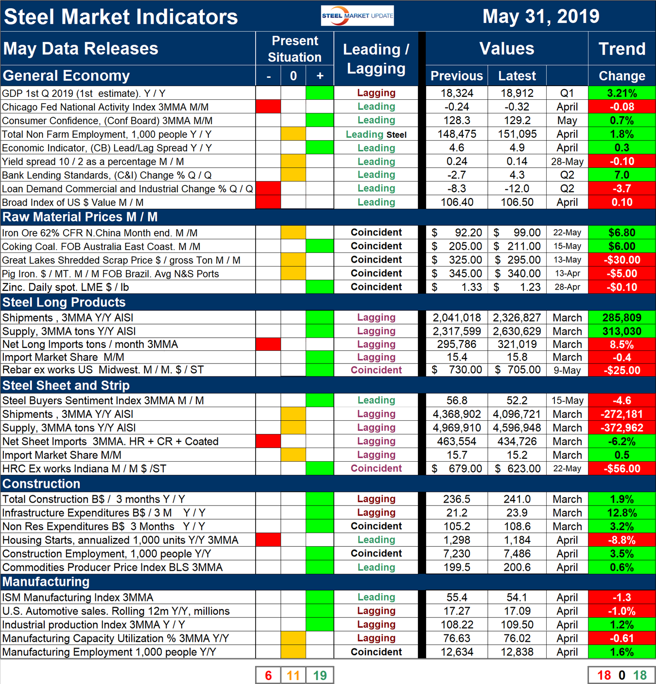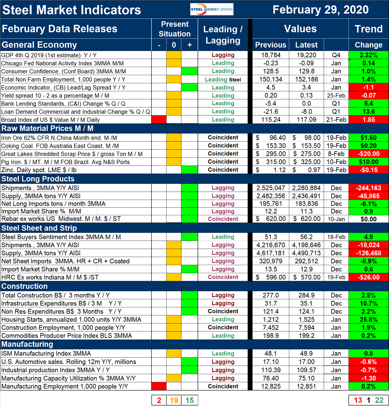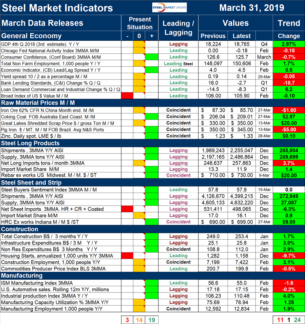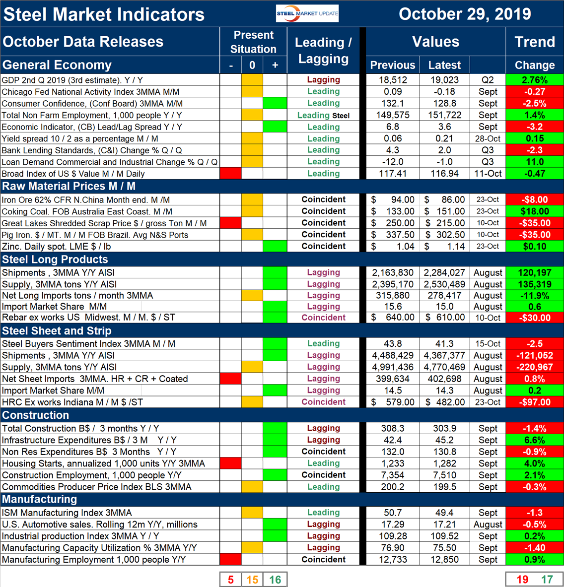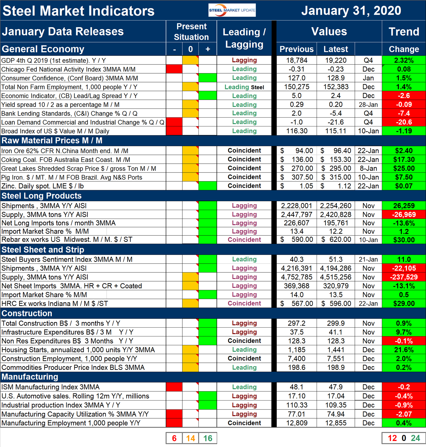 Steel Market Update’s Key Market Indicators are composed of economic and steel industry factors that are compiled and analyzed by SMU market analysts. They are broken into the following categories: General Economy, SMU Indices, Long Product Steel, Flat Rolled Steel, Construction, and Manufacturing. The table below represents the current meta-analysis of all of our Key Steel Market Indicators. For more information about each data set please click on the links in the ‘Indicators’ box to the right. An explanation of the Key Market Indicators is provided beath the table.