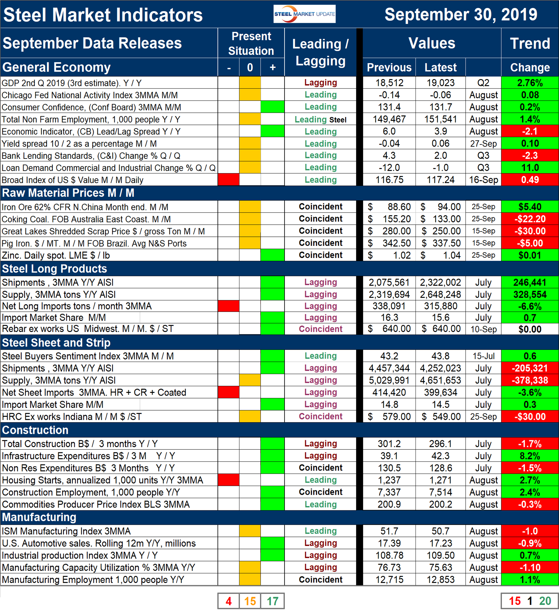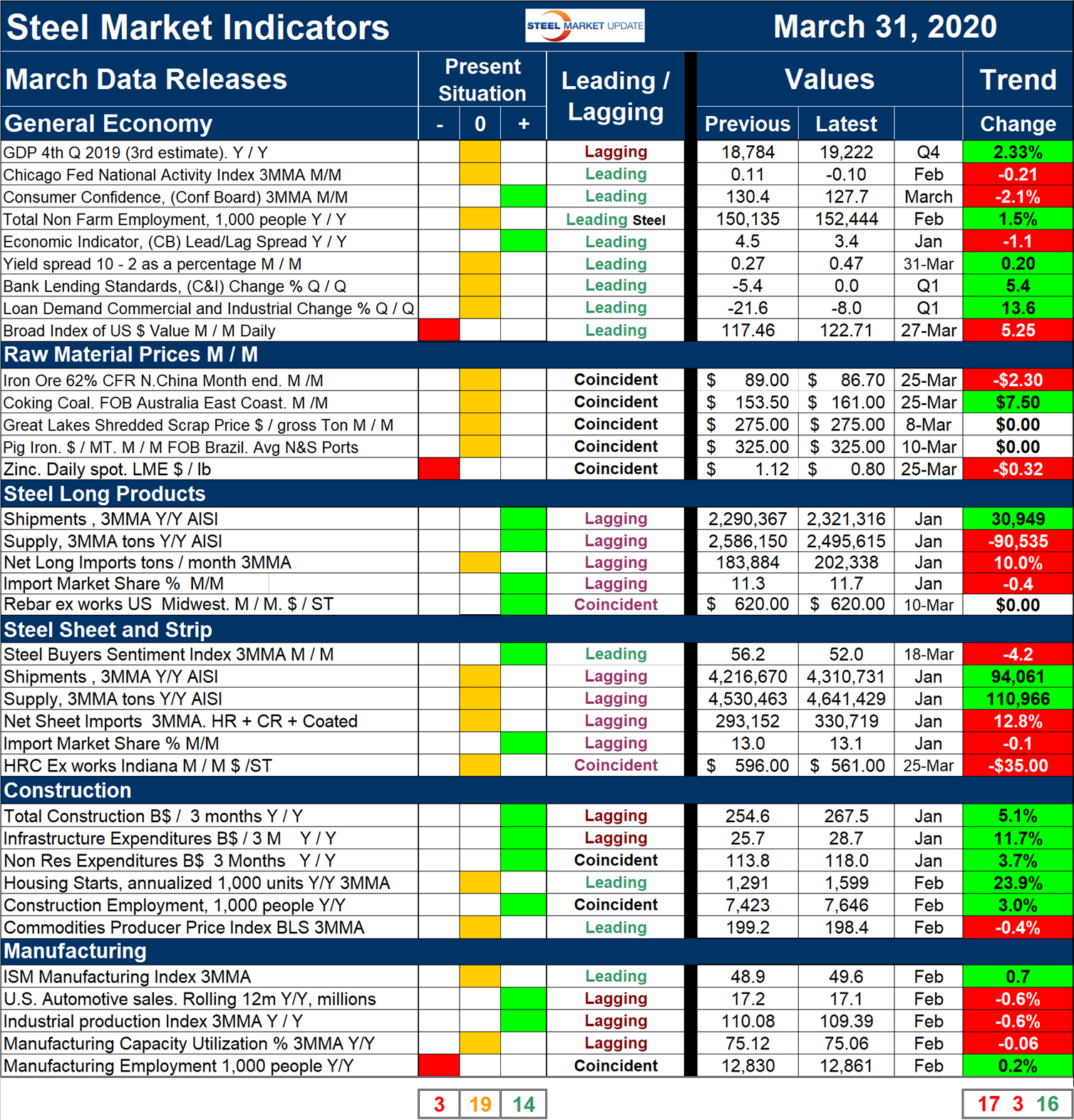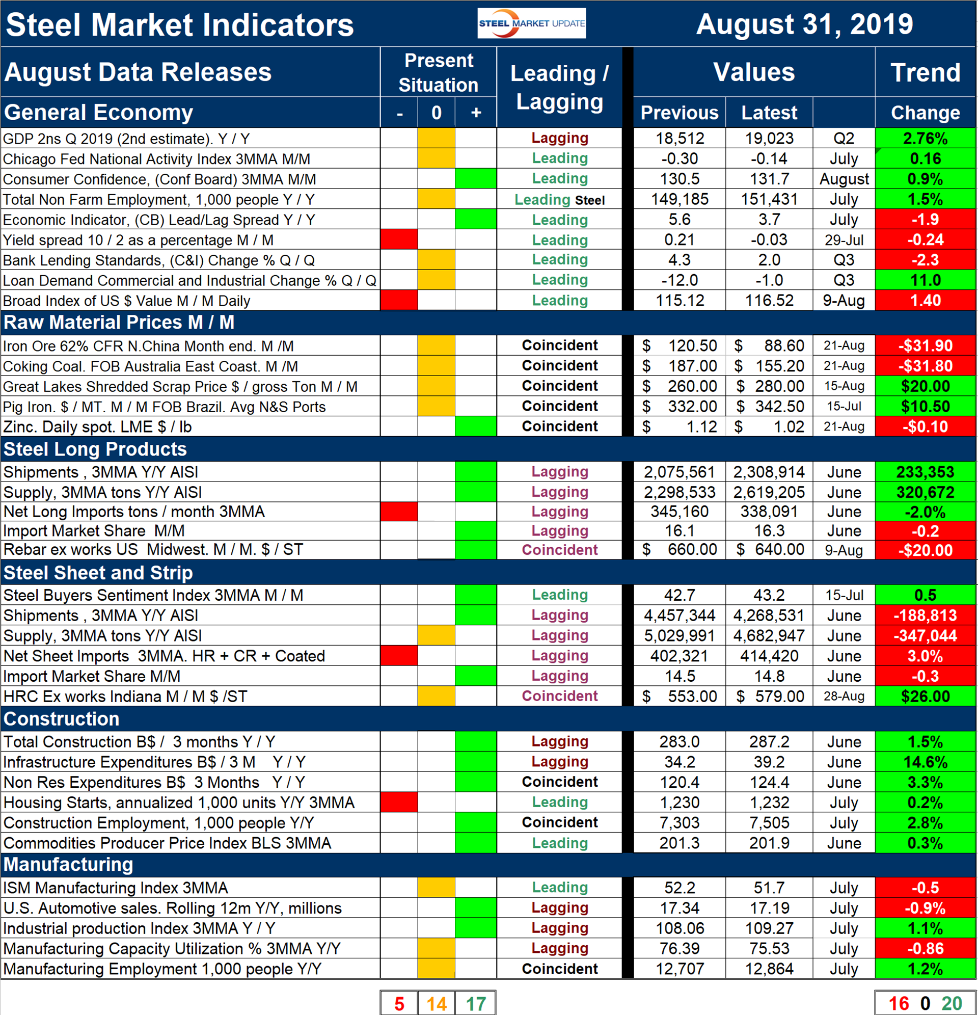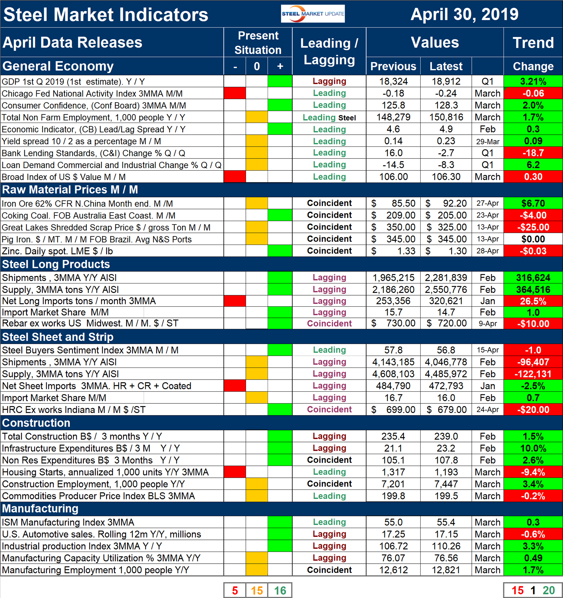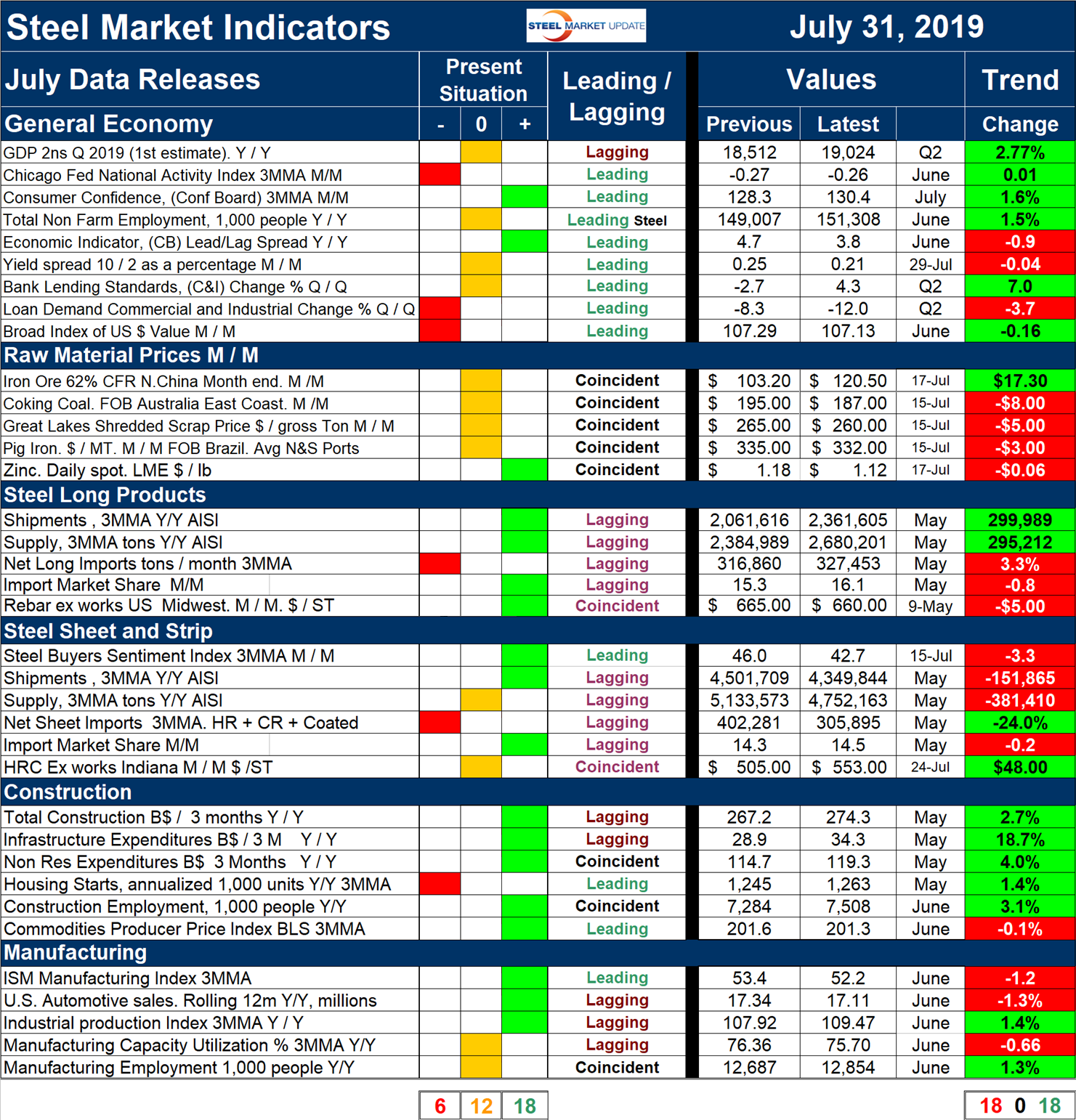 Steel Market Update’s Key Market Indicators are composed of economic and steel industry factors that are compiled and analyzed by SMU market analysts. They are broken into the following categories: General Economy, SMU Indices, Long Product Steel, Flat Rolled Steel, Construction, and Manufacturing. The table below represents the current meta-analysis of all of our Key Steel Market Indicators. For more information about each data set please click on the links in the ‘Indicators’ box to the right. An explanation of the Key Market Indicators is provided beath the table.