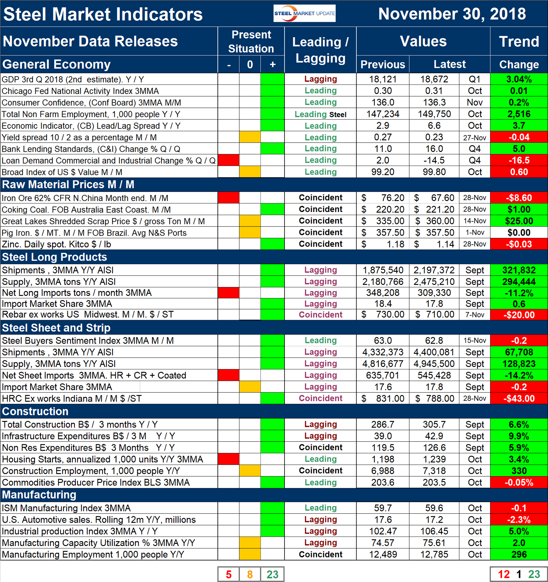 Explanation: The key indicators chart is designed to give a snapshot of the steel market on a specific date. The chart is stacked vertically to separate the primary indicators of the general economy, of proprietary Steel Market Update indices, of both flat rolled and long product market indicators and finally of construction and manufacturing indicators. The indicators are classified as leading, coincident or lagging as indicated.